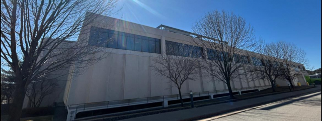 This complex was erected in 1967 in a Brutalist/Contemporary style. One hallmark of this style are the pre-cast, concrete slabs used for construction. The windows and solid areas create a continuous pattern of void/solid around the buildings. The first level windows of the main building give it the distinct look of hovering above the ground. The three buildings are connected using a second story bridge.