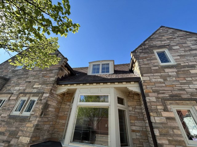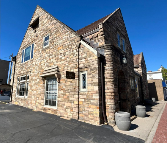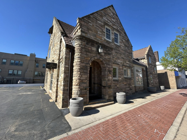 This stone English Revival was built in 1939. It has arches, a steeply pitched roofline, and its front elevation is asymmetrical – which are all typical of the style.