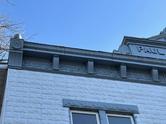Although the building says 1907, the building goes back a bit further to the late 1880s. The history is a bit murky, but it seems the building may have had a fire and Stolze re-built the building in 1907. It shows an Italianate style (note the roofline details in the photos) with textured metal siding. An unusual feature is the side entrance. The building has room for business on the first level, and living quarters on the second floor.