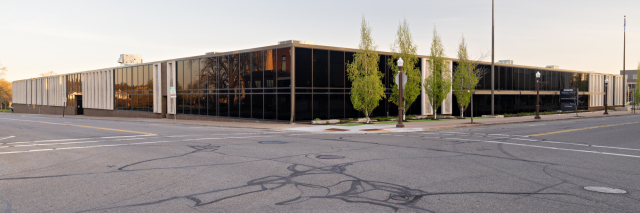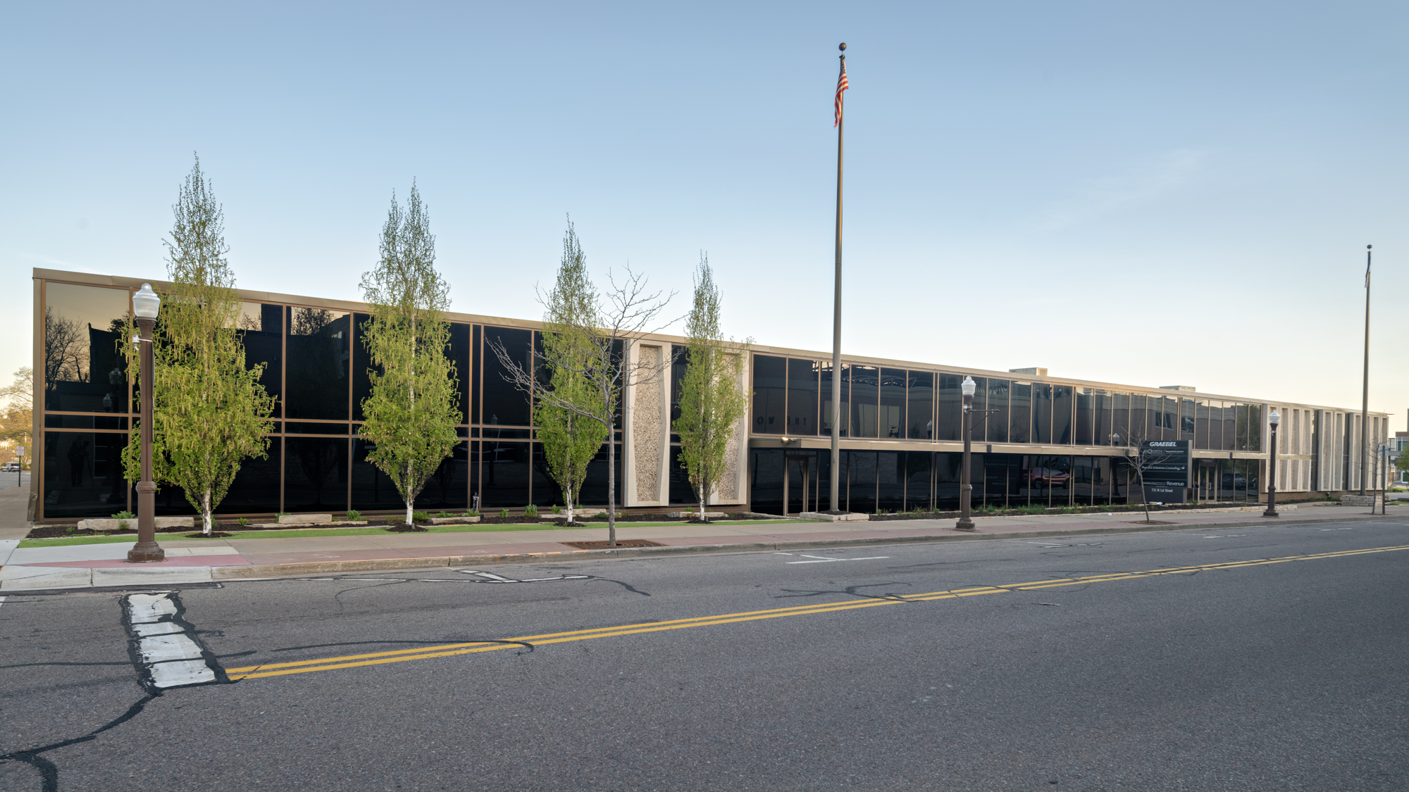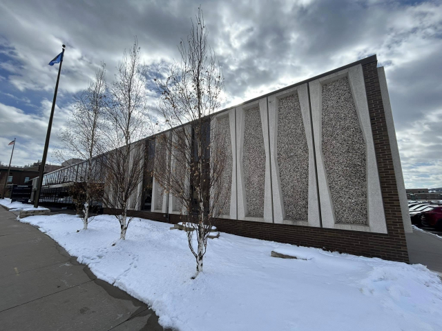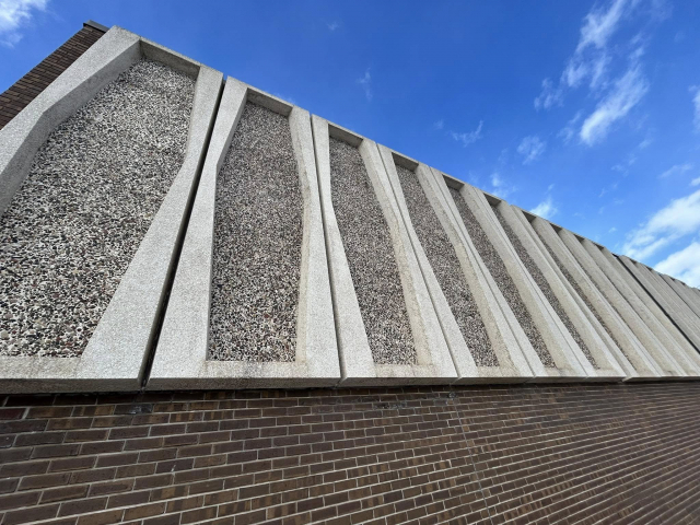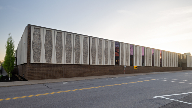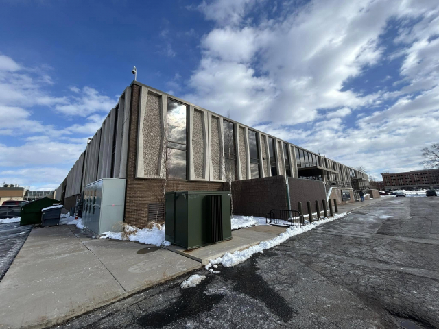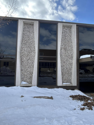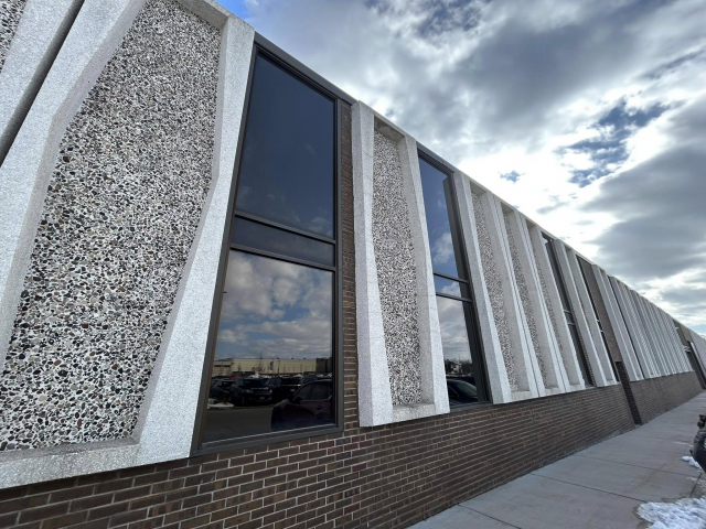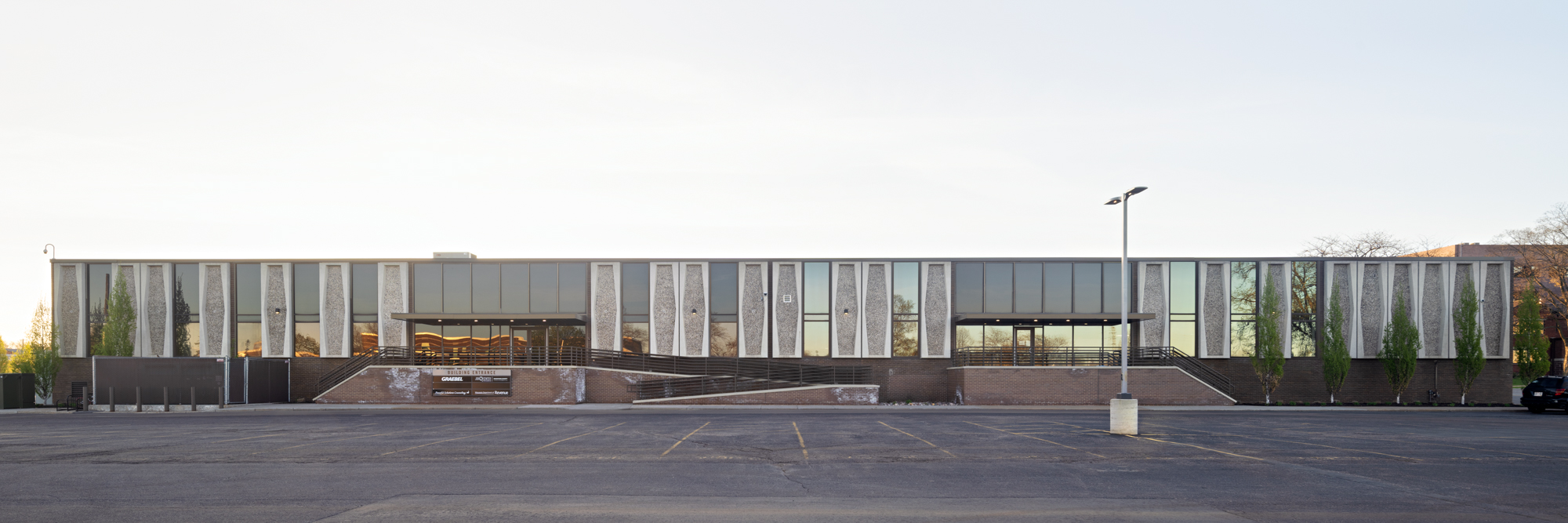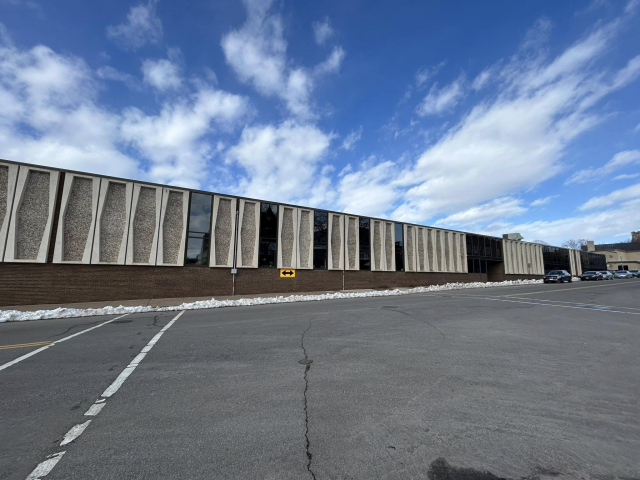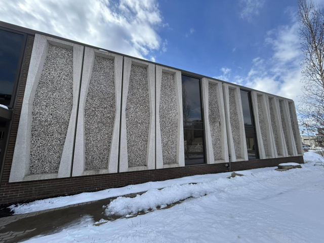 The building was raised in 1968 and is made of cement slabs and brick. It is one story and has a flat roof line. Its most recognizable feature is the decorative mixed stone slabs (kind of reminiscent of Terrazzo). Although the some of the front facade has been altered to add more windows, the other three sides retain more of this feature. The main entrances are denoted by an expanse of glass and a canopy style roof