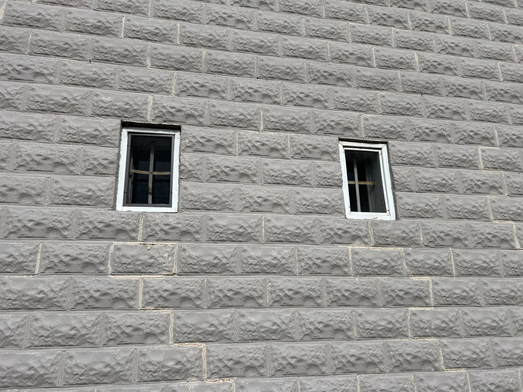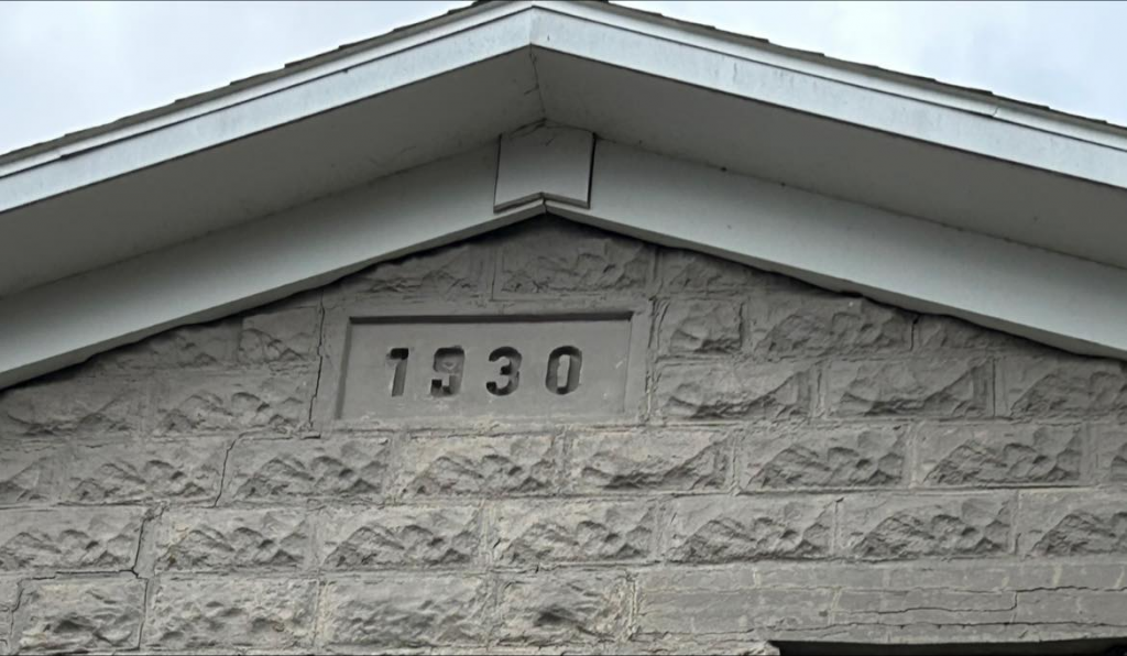 As the date by the roofline says, this was built in 1930 in a commercial style typical of taverns. It is built with rusticated concrete blocks (with a stamped pattern). Rusticated blocks were popular as an inexpensive alternative to brick, and for their fire proof qualities. Henry Ford was a big supporter of using them in construction.