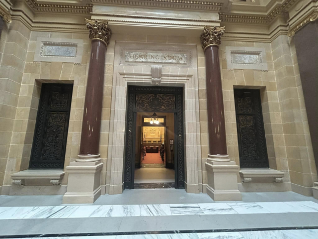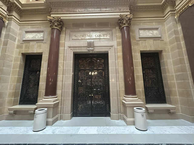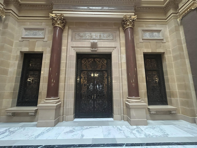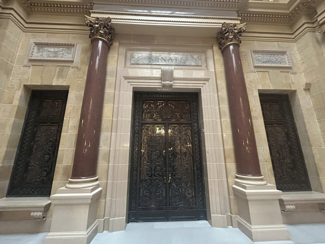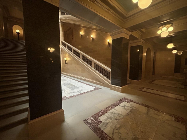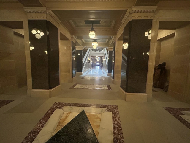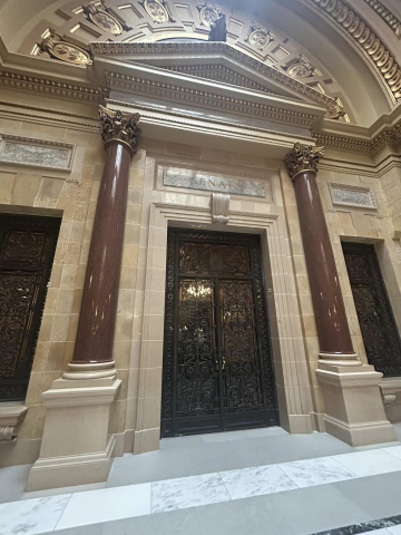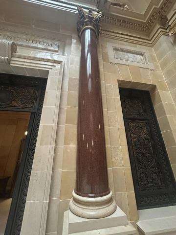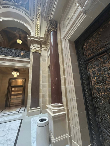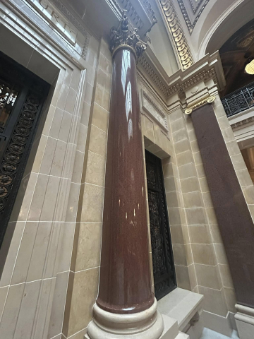 But most impressively, is the granite from Marathon County that is a part of the amazing interior that includes 43 types of stone and the largest granite dome in the country at just over 284 feet. First is the Wisconsin Green granite that was used to create the pilasters in the corridor that surround the rotunda on the ground floor, as well as the piers in the grand stair halls. Secondly is the Wisconsin Red in the columns at the legislative chamber lobbies.